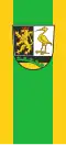 A red-white-green horizontal tricolour flag with the coat of arms. The rose symbolizes Altenburg, a reborn world and the future. The lion represents the Margravate of Meissen. The yellow and white lion represents Pleissnerland. The nine black and yellow stripes with a green crown represents the House of Wettin. The acorn alludes to the district's status as the birthplace of game of Skat.