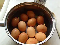 Plain | This dish is boiled either long enough for the yolk to become solid ("hard boiled") or just long enough for the egg white to solidify ("soft boiled"). A similar result may be achieved by steaming the eggs rather than boiling.[6] | |