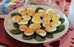 Savory | England Spain | Yolks of hard-boiled eggs are mashed with cream or mayonnaise, mustard, and seasonings and then mounded or piped into the white of the boiled egg. Served cold, often al fresco. |