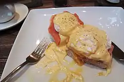 Savory | United States | Poached eggs on Canadian bacon on top of toasted English muffin halves covered with hollandaise sauce. |