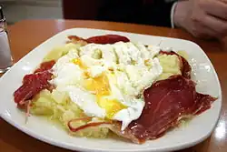 | Buttered eggs | Plain | England | Scrambled eggs with additional butter melted and stirred into the egg mixture before cooking.[7] | |