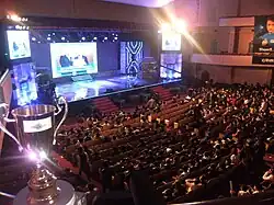 By the end of 2011, Dota 2 was already one of the highest-paying esport games, second only to StarCraft II.[83] At E3 2013, South Korean company Nexon announced the investment of ₩2 billion (approximately US$1.7 million) into local leagues in the country, which coincided with their distribution partnership with Valve for the game.[84] In February 2015, Valve sponsored Dota 2 Asia Championships was held in Shanghai with a prize pool of over $3 million, raised through compendium sales.[85][86] Since then, other Dota 2 Asia Championships have taken place, with it being sometimes being referred to as the "Chinese International".[87][88] In total, professional Dota 2 tournaments had earned teams and players over $100 million by June 2017, with over half of that being awarded at the International tournaments, making it the highest earning esport game by a margin of nearly $60 million.[89]