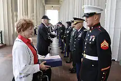 November 11: the American Legion and South Park commissioners organized a commemoration of Armistice Day marking the stadium's name change from "Grant Park Municipal Stadium" to "Soldier Field". The day began the firing of guns at sunrise. At eleven in the morning, a 21-gun salute was fired in Chicago's Grant Park and people in the 'Chicago Loop' paused, men removing their hats, and held moment of silent prayer and reflection. In the afternoon, former Governor of IllinoisFrank Lowden and naval officer John A. Rodgers were the guests of honor in the ceremonies held at Soldier Field. At the time Rodgers was a national hero, following his attempted nonstop flight two months earlier, and was all-over the news.[59][60][61][62][63][64] Lowden had been heavily involved in the effort to rename Soldier Field. Much like Rodgers, Lowden was also a prominent national political figure at the time. The event at Soldier Field began with decorated war veterans escorting Gold Star Mothers to their seats, and a salute fired by field artillery. The Flag of the United States was then raised, followed with a large banner baring the words 'Soldier Field' that had been carried into the stadium by the Gold Star Mothers. This was followed with a parade led by an Army general. The parade featured sailors from the nearby Great Lakes Naval Station, Reserve Officers' Training Corps units, and various veterans groups (including the Grand Army of the Republic). Following the procession of the parade, Rodgers spoke about his attempted non-stop flight. Other speakers included South Park Board-member, and future-mayor, Edward J. Kelley. The ceremony was attended by over 20,000 spectators.[1][3][4][30][65][66][67][68][69]