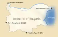 Bulgaria's northernmost point is where the Timok River flows into the Danube. The northern tip of Bulgaria is located in the Vidin Province, and neighbours the Mehedinți County of Romania. The closest Bulgarian village to that area is Vrav.[1] Bulgaria's most southern point is in the Kardzhali Province's Mount Veykata. At 1,463 metres (4,800 ft), Veykata is the highest Bulgarian peak of the Gyumyurdzhinski Snezhnik ridge in the Eastern Rhodope Mountains,[2] and borders the East Macedonia and Thrace periphery of Greece.[3] Bulgaria's westernmost point is in Vrashka chuka saddle.[4] This is the point where the Vidin Province borders both the Zaječar District of Southern and Eastern Serbia.[5] Cape Shabla is Bulgaria's easternmost point;[6] it lies in the Dobrich Province, on the country's Black Sea outlet.[7] This table excludes St. Kliment Ohridski Base, Bulgaria's station in Antarctica.[8]