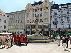 This is a list of fountains, drinking fountains and water wells in Bratislava, the capital of Slovakia. Approximately half of the over 140[1] fountains found in the city form part of the picturesque landscape of the medieval Old Town of Bratislava (the city was known in the past under many names) and serve as tourist attractions while many of the newer fountains are fine examples of socialist era building of modern panelák city suburbs. The number of fountains in Bratislava is comparable to the four times larger neighboring Austrian capital Vienna.[2]