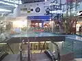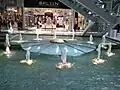 Not functional, the fountain is uninstalled from its basin. It used to contain spheres made of stainless steel and chrome and it was designed together with the huge lamp above the fountain. | |