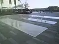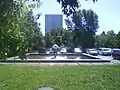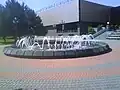 The main, outside part of the system of fountains that includes one long but narrow pool that actually runs through the main entrance hall and continues on the outside, it was constructed by Slovak company Mramor Ltd.. It is made of steel and tiles. |