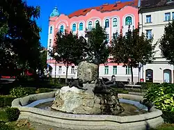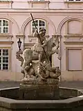 Built in the mid-17th century in the Grassalkovich Palace garden the sandstone figure of Saint George is modeled after its patron, Archbishop of Esztergom Juraj Lippay. It was moved to its current location in 1930. Dragon heads were later reconstructed by Alojz Rigele. The fountain features in local legends. | |