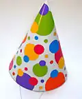 | Party hat | A conical hat, similar to the dunce cap, often worn at birthday parties and New Year's Eve celebrations. It is frequently emblazoned with bright patterns or messages. | ||