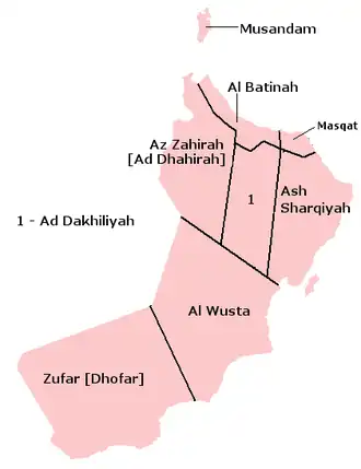 - ^ Until October 2006, the area of Al Buraimi was part of Ad Dhahirah Region. At this time, the new governorate was created from the Wilayats (Provinces) of Al Buraymi and Mahdah.