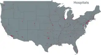 As of 2020, there were 5,250 acute care and critical access hospitals in the United States. In the decade from 2010 to 2020, dozens of hospitals have closed in rural areas of the United States, particularly in the southeast. Of the 3,143 county-equivalents in the United States, there were 700 counties in the United States with no hospitals as of 2020.[3] The following list contains links to the lists and the number of articles in the main category for each state. There may be additional psychiatric, county, and teaching hospitals not included in the main category.
