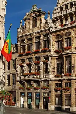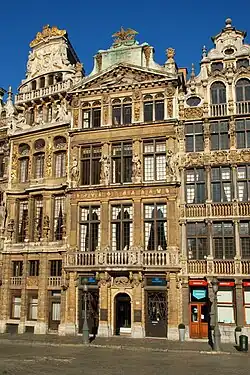 The Grand-Place/Grote Markt in Brussels, Belgium, is lined on each side with a number of guildhalls and a few private houses. At first modest structures, in their current form, they are largely the result of the reconstruction after the bombardment of 1695. The strongly structured façades with their rich sculptural decoration including pilasters and balustrades and their lavishly designed gables are based on Italian Baroque with some Flemish influences.[1][2] The architects involved in the new development were Jan Cosijn, Pieter Herbosch, Antoine Pastorana, Cornelis van Nerven, Guilliam or Willem de Bruyn[3][4] and Adolphe Samyn.[5][6][7]