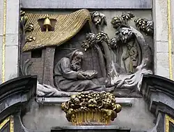 House of the Corporation of Greasers | Former property of the Corporation of Greasers since the 15th century, built in stone in 1644. The façade partly resisted the bombardment of 1695 and was rebuilt in 1696–97 probably by Jan Cosijn. Decorated with a statue of Saint Giles (patron saint of greasers), it was restored in 1894–1913. The left door opened into a now disappeared alleyway that led onto the Rue au Beurre.[9] |