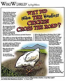 - Mike the Headless Chicken, a Wyandotte rooster of Fruita, Colorado, who lived for 18 months after his head was cut off. The botched decapitation in 1945 missed his brain stem and jugular vein. His owners fed him thereafter with an eyedropper, and took him on tours of the West Coast. He died in 1947.