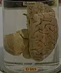 The French anatomist Paul Broca, for whom Broca's area in the frontal lobe of the brain is named, died in 1880. His own brain became part of the collection of brains held by the Musée de l'Homme. Carl Sagan wrote about holding the brain in his hands in his 1979 book Broca's Brain. The brain is kept in a low cylindrical bottle, fragmented, and preserved in formalin.[32][33] | ||