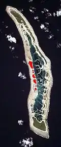 | Scarlet Crab Islet | 5,000 m2 | Named for the scarlet hermit crab abundant on its shores, Scarlet Crab is a young and small islet, measuring 40 m north–south and 125 m east–west, and lying just off the southern coast of Shark Islet. Its reef flats are the most extensive of those on the leeward side of the atoll, extending out some 480 m. Vegetation is slight and covers only a fraction of the islet. | ||