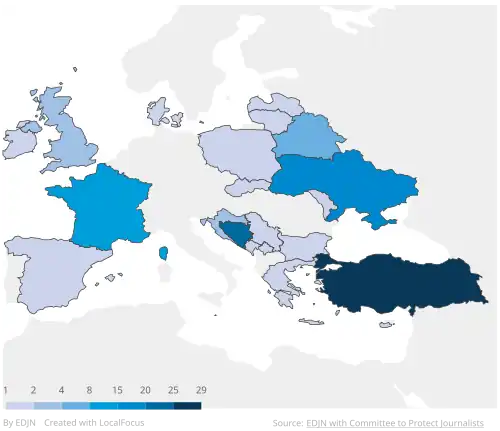 While journalists in the European Union (EU) generally work in good conditions, there are cases of murdered journalists, and many of them remain unpunished.[1] This list includes non-EU countries within Europe such as Turkey, Ukraine and Russia.