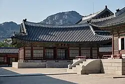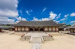 The main hall[b] of the palace[73] and a designated National Treasure.[71] It was used for major events like ceremonies and the issuing of edicts.[74] It was completed in 1395.[66][21][75] Five kings were coronated here, including Sejong in 1418.[74] It was destroyed in 1592 and reconstructed in 1867. It has remained in much the same form to the present.[76] It is the largest main hall of all Joseon palaces and is regarded as examplary of late-Joseon architecture. Like other Joseon main halls, it has a wŏltae in front used for ceremonies.[76] |