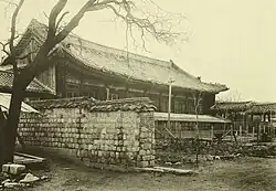 One of the main buildings used for the education of the crown prince.[123] It was first built in 1427. It was destroyed in 1592 and rebuilt in 1865.[89][90] It was again destroyed in the 1867 fire, and was rebuilt by 1888.[124] In 1914, the building was sold and later reassembled in the private home of Japanese businessman Ōkura Kihachirō in Tokyo.[125][126] It was destroyed in the 1923 Great Kantō earthquake.[124] Its remains were returned to Korea around 1996,[125][126][124] and are now on display near Geoncheonggung.[126] In 2001, Jaseondang was rebuilt on its original spot.[127] |