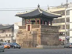 A watchtower that used to be on the eastern palace walls. It was likely originally built in 1398 and demolished in 1427.[56] It was rebuilt in the 6th month of 1866.[56] It became separated from the palace walls around the 1929 Chōsen Exhibition.[57][26][58] It served as the centerpoint of the outer main entrance to the entrance of the exhibit; the relocated Gwanghwamun was the inner main entrance.[59] |