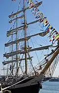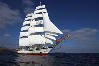 1953 | S | Echevarrieta & Larriñaga, Cadiz | 371 ft (113 m) | 43.3 ft (13.2 m)[19] | 4-mast barquentine | Steel | 26,555 sq ft (2,467.0 m2)[20] | 3,754[21] | training ship | |