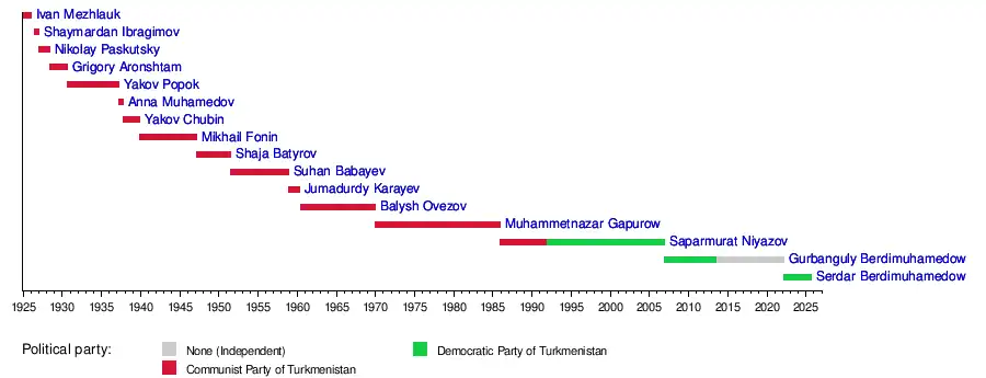 Below is a list of leaders of present-day Turkmenistan since the establishment of Turkmen SSR in 1925.