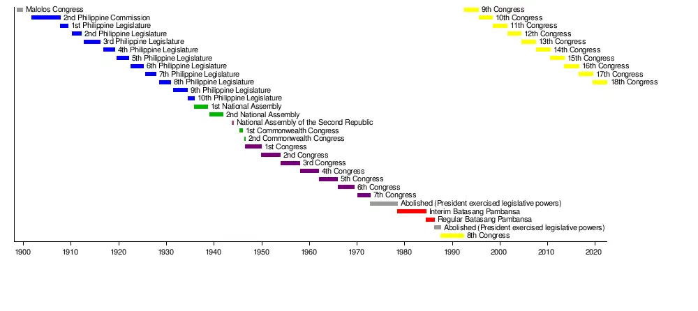 The Philippines has been governed by legislatures since 1898. The country has had different setups, with legislatures under the presidential system and the parliamentary system, and with legislatures having one or two chambers.