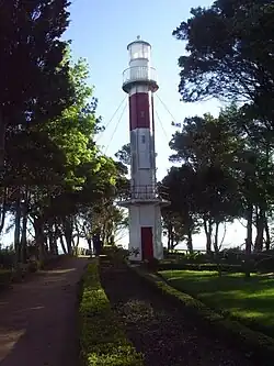 Morro Gonzalo. | 39°50.9′S 73°28.0′W / 39.8483°S 73.4667°W | Fl.W. period 5s fl. 0.4s, ec. 4.6s | 144 44 10 | White square concrete tower, red band; | 13. | Visible 026°-272°. |
