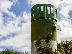 White fiberglass tower, red band; | 13. | Visible 245°-080°. |