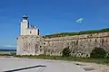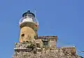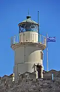 1863 | 6 m | 25 m | 11 nmi (20 km) | Built by the French, this lighthouse is situated atop St. Elmo tower in St. Nicholas Fortress in Mandraki Harbor. Its flashing, white light was able to be seen 14 miles (23 kilometres) away. The tower, made of masonry, was rebuilt in 2007. The lantern was also refitted and restored. It now contains a 300mm optic (produced by the Tideland company).[2] |