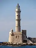 1864 | ? m | ? m | This lighthouse is located at the tip of a stone fortification. It consists of a lantern and gallery atop a stone column resting on a square base of stone. The top third of the column round, the bottom two-thirds being octagonal. The structure is unpained. The Venetian lighthouse of the Port of Rethymnon is the second largest Egyptian Lighthouse of Crete, after the lighthouse of Chania.[5] | |
