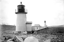 This is a list of all lighthouses in the U.S. state of Massachusetts as identified by the United States Coast Guard. Enumeration of the lighthouses in this state is complicated by the number of multiple tower stations and replacement of older towers, with the Brant Point Light station having had nine towers, two of which survive.[1] At present there are forty-seven active towers, of which eleven are privately maintained; thirteen are standing but inactive, seven have been replaced with skeleton towers, thirteen have been destroyed or removed, and one tower has been moved to another state. The oldest station, Boston Light, established in 1716, was the first lighthouse built in the colonies, and the current tower at that station, built in 1783, is the oldest survivor in the state and the second oldest in the nation, and was the last lighthouse automated in the United States.[2] The last station established was at the Buzzards Bay Entrance Light in 1961 (since replaced by an automated light on a steel tripod), but in 1986 the 1818 Great Point Light was rebuilt and relit, making it the last tower constructed in the state. The tallest towers in the state are the two Cape Ann Light towers, but the highest focal plane is at the Hospital Point Range Rear Light, which is located in the steeple of the First Baptist Church of Beverly.[2]