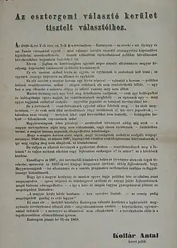 1869 parliamentary election poster of Antal Kollár, mayor of Esztergom