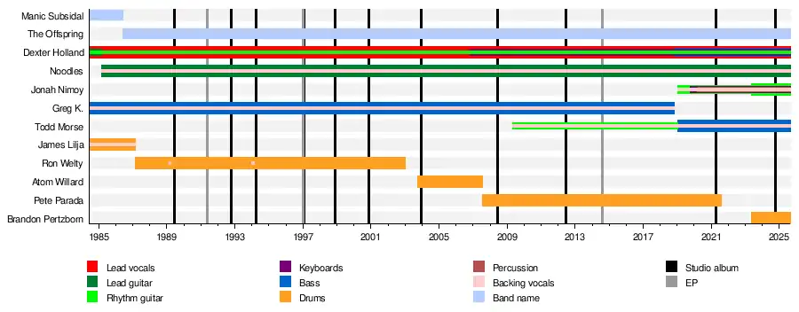 The Offspring is an American punk rock band from Garden Grove, California, formed in 1984.[1] Originally formed under the name Manic Subsidal, the group originally included vocalist and guitarist Dexter Holland (real name Bryan Holland), bassist Greg K. (real name Greg Kriesel) and drummer James Lilja. The band's current line-up includes Holland, alongside lead guitarist Noodles (real name Kevin Wasserman; since 1985), bassist Todd Morse (since 2019, and touring rhythm guitars from 2009 to 2019), multi-instrumentalist Jonah Nimoy (since 2023, as touring musician from 2019 to 2023) and drummer Brandon Pertzborn (since 2023).
