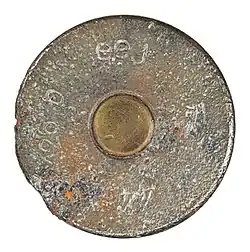 In 1953, US Army Intelligence ordered 250 million rounds of .30-06 ammunition to be manufactured in large lots under unique arsenal headstamps.[4] The case had red lacquer sealant around the primer annulus.[4] The headstamp has a two-letter manufacturer code (10- and 2-o'clock) and the lot code (rather than the year) is the number 40 (at 4 o'clock) followed by a third numeral (at 8 o'clock). This was divided by radial segment lines, like that of a Square (or Hellenic) Cross, between the portions to look like they were of European manufacture.[4] The cartridges were intended to be aid to anti-Communist insurgents and Allied forces equipped with US weapons. They were loaded in 5-round stripper clips in M1 bandoleers (holding 6 × 5-round clips in cardboard spacers, or 60 rounds each) packed in US Navy 20mm Mark 1 metal ammo chests (33 × 60-round bandoleers; or 1980 rounds each). The chests were painted Olive Drab Green with subdued black lettering.