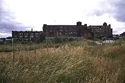 Western No 1 is an integrated mill with a spinning block with integral engine house, chimney, reeling and winding rooms, weaving shed and warehouse. It is dated 1884 on the parapet above the entrance bay. The spinning block is built in red brick with a plinth of blue engineering brick and sandstone dressings. It is a Grade II listed building.[71] Possibly already demolished. Western No 2, dated 1888 is an integrated mill comprising a spinning block with boiler house, engine house and chimney, winding and beaming rooms. Its weaving shed has been demolished. The four-storey spinning block is built of common brick with sandstone dressings and has a concealed roof. Its two-storey winding and beaming rooms have a deep basement. Its chimney has a plinth of blue engineering brick and tapered octagonal shaft. It is a Grade II listed building.[72] Western No 3 Mill, dated 1900, is a spinning mill with a boiler house, chimney and engine house, and a beaming and reeling block. The mill is used as a warehouse. The four-storey mill is built of common brick with sandstone dressings and has a concealed roof. It has a square tower rising above the parapet.[73] Altogether Eckersley's mills housed 236,572 ring spindles, 14,554 mule spindles and 1687 looms.[68] |