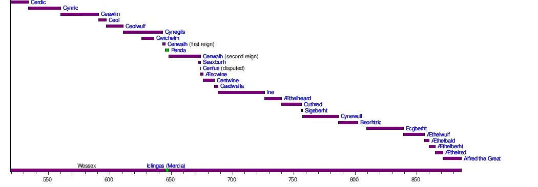| 786 to 802 | Beorhtric | Possible direct descendant of Cerdic. Son-in-law of Offa of Mercia. |