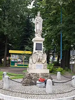 - The monument commemorating the 500th anniversary of the Battle of Grunwald was initiated by Senator Stanisław Białek. It is located next to the current PKS bus station on Grunwald Square. During its dedication on 27 June 1910, school inspector Józef Lorenz delivered a speech titled "Education of Our People."[1] The monument is listed in the register of historical monuments under number B-34/2001.[2] Designed by Lviv sculptor Władysław Gawliński, the monument was crafted from stone. It features a rectangular base supporting a cuboid, topped with a statue of Jadwiga of Poland. A plaque reads: "To the Queen of the Polish Crown. On the 500th Anniversary of Grunwald 1910". The front of the base displays an eagle sculpture and an inscription: "On 22 July 1946, this monument was renovated and restored to its original form at the citizens' expense".[1]