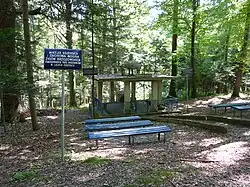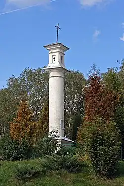 - Around 1772, Bar Confederation fighters battled Russian forces near the border of Stara Wieś and Brzozów.[1] The fallen were buried in a mass grave. Around 1825, Father Józef Sacher, a Jesuit from Stara Wieś, funded an obelisk.[16] The plastered masonry monument consists of a square base with rectangular panels, a column with a capital and profiled entablature, and a rectangular chapel with four niches closed by segmental arches. It is topped with a tented metal roof and an iron cross. A glazed niche at the column's base displays an image of the Stara Wieś Madonna. Before World War II, ceremonies were held there on 3 May, with the Volunteer Fire Department organizing fireworks displays. During construction, two coffins of bones were exhumed and transferred to Brzozów's old cemetery.[1]