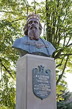 - The monument to King Casimir III the Great at King Casimir the Great High School in Brzozów was erected in 2009 to commemorate the school's centenary.[13] Created by Marian Konieczny from Jasionów, with the surrounding area designed by his brother Adam Konieczny, it was unveiled on 19 September 2009 by its funder, Brzozów County Starosta Zygmunt Błaż.[14]