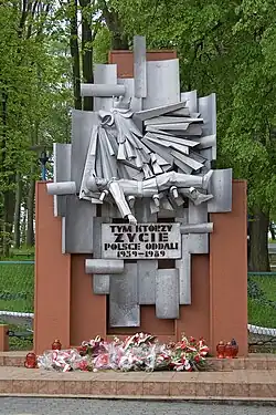 - The National Remembrance Monument to Those Who Gave Their Lives for Poland was originally erected to commemorate the Red Army. Designed by Władysław Niemiec, it was unveiled on 22 July 1950 to mark Brzozów's liberation from German occupation on 3 August 1944.[4] The monument initially featured a star emblem and a plaque stating: "Eternal honor and glory to the heroes of the Red Army, fallen in the fight for the freedom of all peoples". In 1966, to mark the Millennium of the Polish State, a second plaque was added: "966–1966 – In memory of those fallen in the fight for People's Poland, Brzozów 16 April 1966". This plaque covered a niche containing an urn with soil from battlefields and execution sites. The monument was renovated in 1974 by the Brzozów County Commission for the Protection of Monuments of Struggle and Martyrdom.[1] In 1990, the Temporary Committee for the Construction of the National Remembrance Monument, under the Brzozów Branch of the World Association of Home Army Soldiers, was formed to transform the Red Army monument into one commemorating Those Who Gave Their Lives for Poland. Its activities were reported in the Cegiełkogazetki newsletter.[4] On 11 November 1992, the monument's name was changed to To Those Who Gave Their Lives for Poland 1939–1989. The unveiling was performed by Jan Salamak, a Home Army veteran and one of Brzozów's oldest residents, Mayor Józef Rzepka, and Town Council Chairman Lucjan Krynicki. The monument was consecrated by Father Julian Pudło, and a trumpeter played the Brzozów Anthem.[5] The redesigned monument, created by Adam Zarych from Blizne, features an eagle symbolizing the fight against fascism and communism.[4][6]