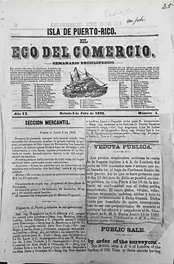 | El Eco del Comercio: semanario enciclopédico[51] | Ponce[52] | 1861 (Jun)[52] | 1867 (c.)[51][53] | Encyclopedic Weekly; Lázaro Martínez, editor.[52] | |
