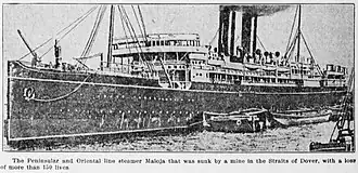 | SS Caledonia | 1904 | Torpedoed by SM U-24 on December 4, 1916 | ![]() Caledonia in 1915. |
