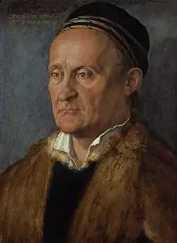 - ^ Attributed by Kemperdick to Dürer's father as a self-portrait on the basis of circumstantial arguments and great stylistic similarities to his self-portrait drawing that could have then functioned as a preparatory drawing. In addition, its differences in style to the Portrait of Barbara Dürer cannot be entirely explained by slightly different dates. Stephan Kemperdick (2013), ""Nach mir selbs kunterfet". Bildnisse und Selbstbildnisse", in Jochen Sander (ed.), Dürer. Kunst – Künstler – Kontext, Exhibition catalogue Städel, Frankfurt (in German), München: Prestel, pp. 93–99, ISBN 978-3-7913-5318-0.
