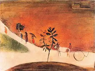 In her early years, Sher-Gil was a frequent visitor to Zebegény, in Hungary.[5] There she painted a church in 1932, and would several years later paint other views of the village including Winter and the Merry Cemetery.[5] The early 1930s were also the years she worked at the École des Beaux-Arts, Paris, painted mostly family and colleagues, and won awards at the annual competitions for portrait and still life for three years in a row.[6] In the summer of 1932, she submitted six paintings to the "end of year concours", Paris, for which she received second mention in her capacity as foreigner.[7] The six included Violins, Nude Self-Portrait with Palette, and Young Girls.[7] In her words, "my work in those days was absolutely Western in conception and execution except for the fact that it was never entirely tame or conventional".[6]