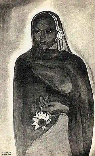Sher-Gil later wrote that "towards the end of 1933 I began to be haunted by an intense longing to return to India, feeling in some strange inexplicable way that there lay my destiny as a painter".[6] She subsequently painted Self-Portrait as a Tahitian in early 1934, while still in Paris.[8][a]