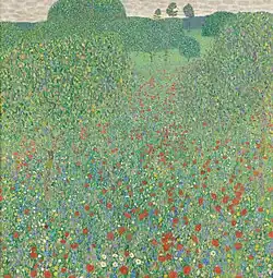 Blooming Poppies[83] | 1907 | Oil on canvas, 110 cm × 110 cm | Österreichische Galerie Belvedere, Vienna | Klimt painted this work in the area around Lake Attersee in Upper Austria, where he spent his summer holidays every year from 1900 onwards.[83] Also known as Poppy Field.[84] |