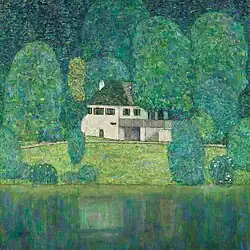On Lake Attersee[51] | 1900 | Oil on canvas, 80.2 cm × 80.2 cm | Leopold Museum, Vienna | Contemporary critics praised the painting at the 10th Secession Exhibition in 1901.[51] It was painted from the jetty of a small boathouse by the Flöge residence during his first stay on the Attersee in the summer of 1900.[52][51] |