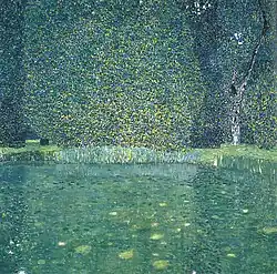 A Morning by the Pond[45] | 1899 | Oil on canvas, 75.2 cm × 75.2 cm | Leopold Museum, Vienna | Klimt's first square landscape it was painted in Eglsee during a summer with the Flöge family in Golling.[45] Also known as Still Pond or Reflection, the painting’s style is reminiscent of Monet’s atmospheric landscapes.[46] |