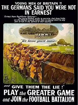 This is a list of pals battalions (also called "service" or "locally raised" battalions) of the British Army during the First World War. Pre-war Territorial Force (T.F.) battalions have not been included, although they too usually recruited from a specific area or occupation. The 69 line infantry regiments formed 142 locally raised battalions and 68 local reserve battalions.[1] The Guards Regiments[2] and the regiments formed only from Territorial Force battalions[3][a] did not form pals battalions.